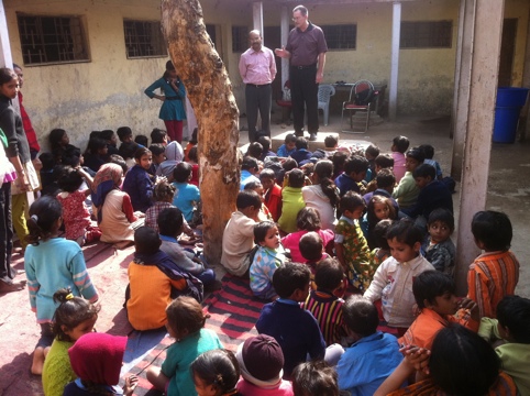 Today we began our work in India in earnest. We divided into two teams to go into two schools and share a Bible story. Our team consisted of Clarity Thoreson, who was to tell the story, Bro. James, and myself. We went to a brand new school the church is starting in Tigri. Classes are not even formally meeting yet, but they have gathered about 60 children from the community each day. We went into the building complex, which was in a state of disrepair, but had basically been given to the church. They introduced us, then sent the kids out to get friends. I counted about 100 total kids and adults there today.
