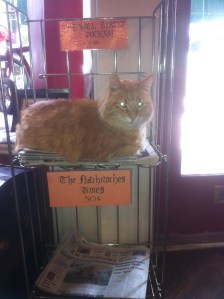 Next was one of the sites I had discovered on the internet the night before, “The Book Merchant.” It is an upscale used bookstore, with some special interest sections on Louisiana history and cooking. It is also guarded at the entrance by “Sam” – a huge yellow cat, who was perched atop the newspaper stand just inside the door, and who allowed me to take his picture before we left!