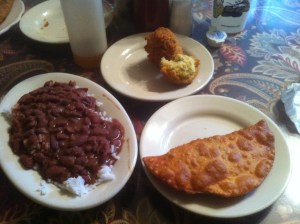 Having made our way through most of the stores along the riverfront, we went just behind the main drag to Lasyone’s, which was rated as a “can’t miss” eating spot, famous for its meat pies, for which Natchitoches is renowned. The shop had that kind of a quaint, “hole-in-the-wall” feel that made for a neat experience, and it features several of the Creole/Cajun foods that Louisiana is known for, such as red beans & rice, and of course, meat pies. Cheryl & I both got the meat pies, which were indeed very good; just the right amount of spice. I was a bit disappointed with the red beans & rice; they were pretty bland – more like something I would have expected from Oklahoma, not from zesty Louisiana. They were “ok” but not spectacular. Cheryl had the mashed potatoes, which one reviewer had raved about – but after tasting them she was fairly certain they came out of a box! (I guess a review is only as good as the source!) The corn fritters with honey were very good – I ate those both as an appetizer and then again for dessert.