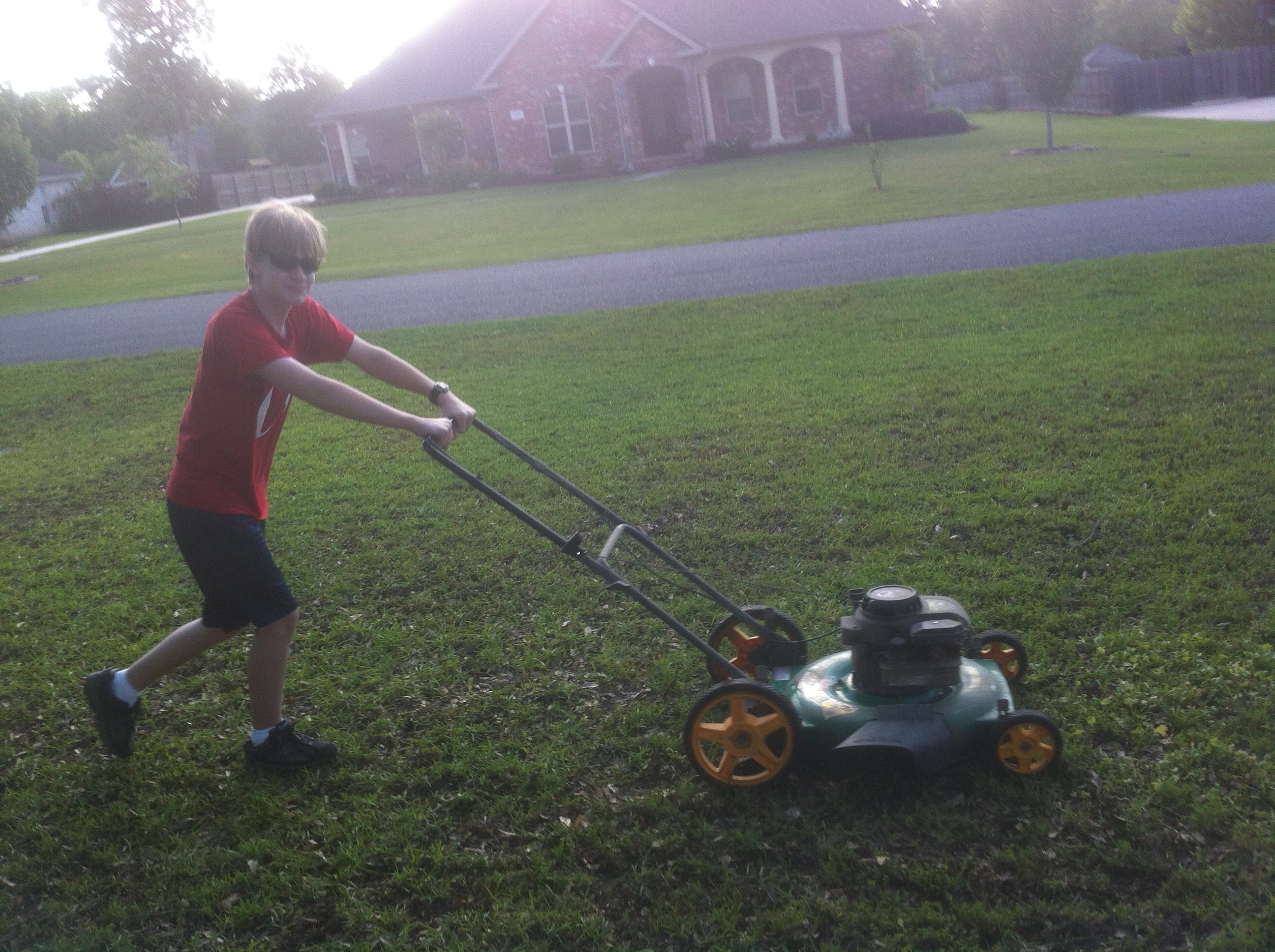 I hated to sit and watch Cheryl & Michael take turns push-mowing the front lawn, but with my condition there is nothing I can do about it. Cheryl sometimes enjoys it as exercise, but Michael not so much. He puts his own “dramatic spin” on it, however. As he walked by me to go out and relieve Cheryl at the mower, I said, “Good; are you going to take over for Mom?”
