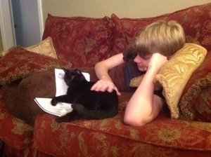 One morning, Michael sat down on the couch to read his history and literature lessons. Our cat Eponine almost immediately jumped up and laid down over his book (for some reason she seems to like the smooth feeling of the paper; she often does that same thing to me too — either that, or she enjoys being the center of attention!) A few seconds later Cheryl walked into the room and raised her eyebrows at Michael, who was just sitting there petting the cat.
