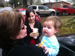 Since two of our children are married with families, attending Southeastern Baptist Seminary in Wake Forest, North Carolina, and one has a baby and the other is expecting, we needed to take a trip east if we were going to have all the kids together for Christmas. So following our church’s Christmas musical the morning of the 22nd, Cheryl, Paul, Michael & I headed out immediately to the east. Almost 24 hours later, we arrived, a bit weary, but so excited to see everyone that we had no trouble staying awake — especially when we saw little Corley Jane, whom we had missed greatly:
