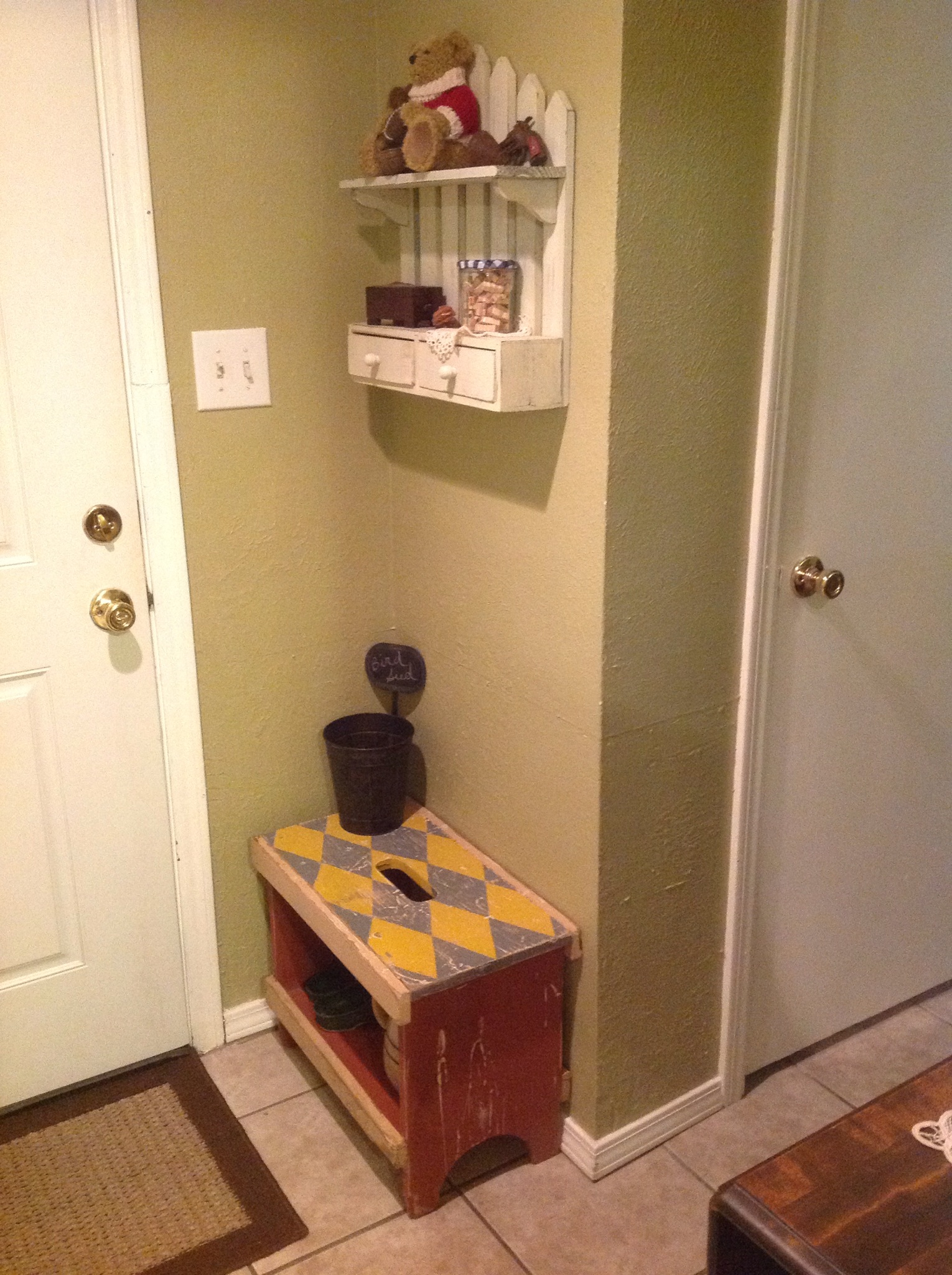 One day while I was at the office, Cheryl fixed up a little “nook” in the entryway of our “Little Condo”, with a wooden bench and a picture (you can see it below). I told her I thought it was really neat. She pointed out all the details about it: “See, there’s bird seed in there, to put out for the birds on the front porch; and a place to put shoes underneath…”, and she added: “You can even sit down here if you need to.”
