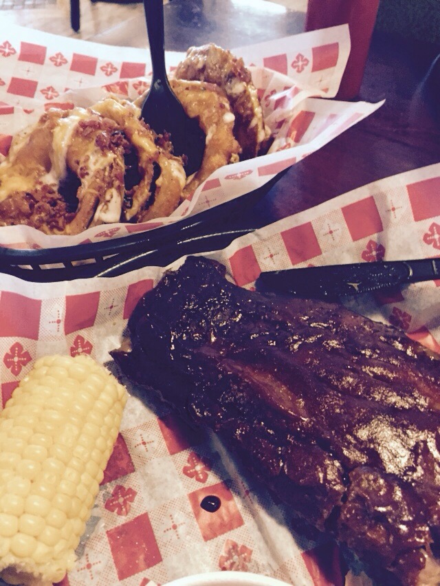 Here is a picture of my meal from Pig-in-a-Poke. By the way, the onion rings were indeed the best I have ever had! They were “loaded” with just the right amount of cheese, bacon pieces, and ranch dressing! And so big I cold only eat two! (oh and the bbq was good too!)