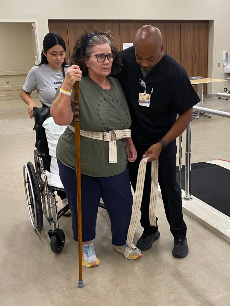 And he worked her hard in the rehab. Some of you saw the video, when after a couple of weeks of rehab, Cheryl was just laboring with the rolling walker — this was after a long hard session already, and Servando didn’t tell her he was going to try to have her walk all the way back to her room. It was about 250 feet to her room, and she hadn’t walked more than 75 feet at a time. He just drove her on, saying “Up … up … up, go … go … go …” while she pushed that walker. It was hard, but it was good. The Lord was using him to help make Cheryl better.