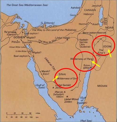 This one shows Mt. Sinai (many believe Jebel Musa at the bottom here is “Mt. Sinai”) and also the Wilderness of Paran (the mountain is located somewhere there); and Edom/which where “Mt.Seir” is.