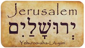 — the word “letter” is the Greek “iota,” (almost exactly like our small letter “i”, the smallest letter). The Hebrew equivalent of the smallest letter would be the “yod,” a small letter that is nothing more than an apostrophe. You can see it here as the first letter (remember the first letter in Hebrew is on the right!) of the word “Jerusalem” (“Yerushalayim”) in Hebrew: