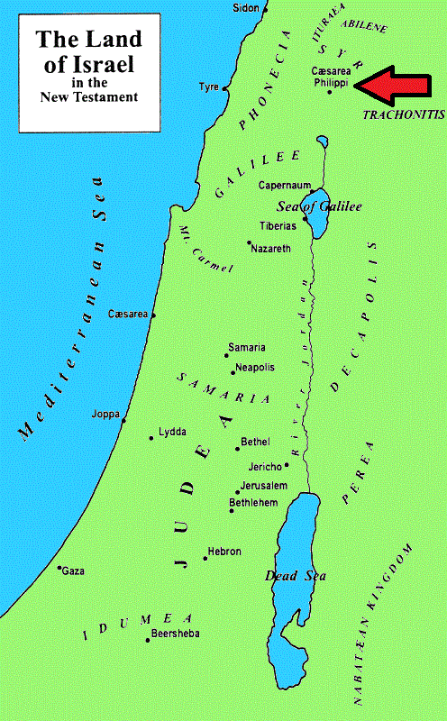 That brings us to our focus passage for today, Chapter 16:13+, which says Jesus came to the region of Caesarea Philippi — NOTE there are TWO “Caesareas” in the Gospels (The word “Caesarea” comes from “Caesar,” they named these places to honor him). One is on the central coast, as you can see in this map, sometimes called “Caesarea Maritima” because it is by the sea. The other, where Jesus is now, is marked by the red arrow, Caesarea Philippi, so named by Philip the Tetrarch, a son of Herod, to honor both Caesar — and himself!