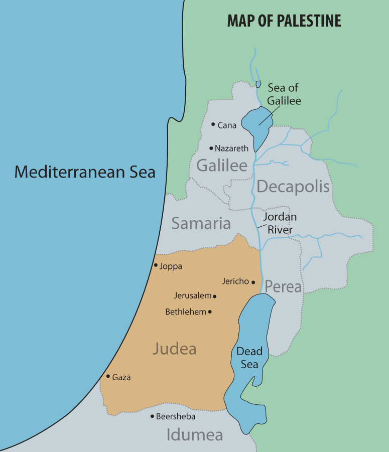 After a jump ahead to Matthew 28 and the Resurrection of Jesus and the Great Commission for Easter Sunday, we return to our regular study of the Book of Matthew this quarter. Jesus had been ministering in the area around Galilee — we’d seen Him come down from the Mt. of Transfiguration in Chapter 17, and teach on sin and forgiveness in Chapter 18 — so now Matthew 19 opens by saying in :1, “When Jesus had finished these words, He departed from Galilee and came into the region of Judea beyond the Jordan” where He ministered and taught some more there. “Judea beyond the Jordan” describes the area called “Perea,” which was “beyond” (or on the other side, from the Jews’ perspective) of the Jordan River, as you can see on this map. This is where our lesson for today unfolds.